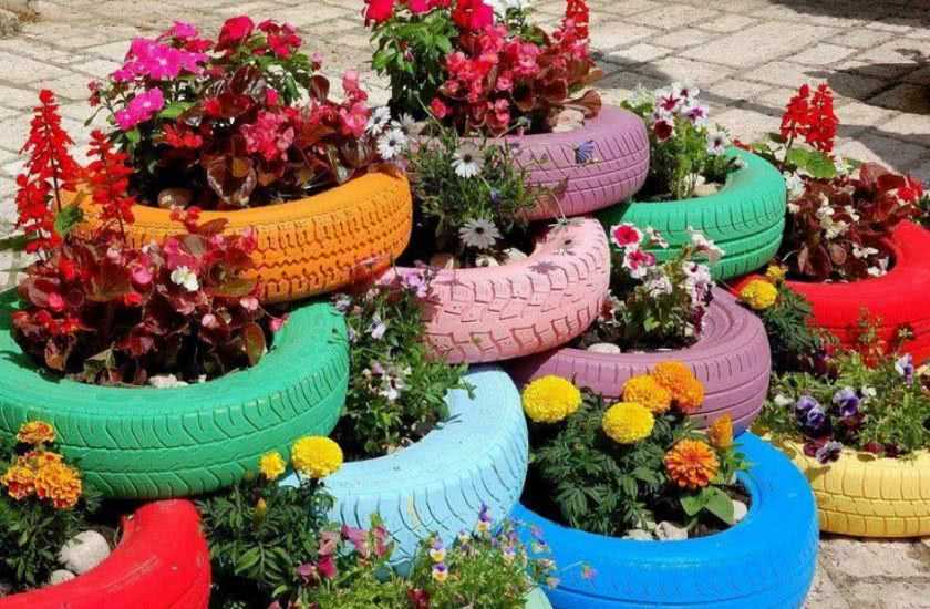 - Следующий этап – заполнение шин грунтом и посадка цветов;