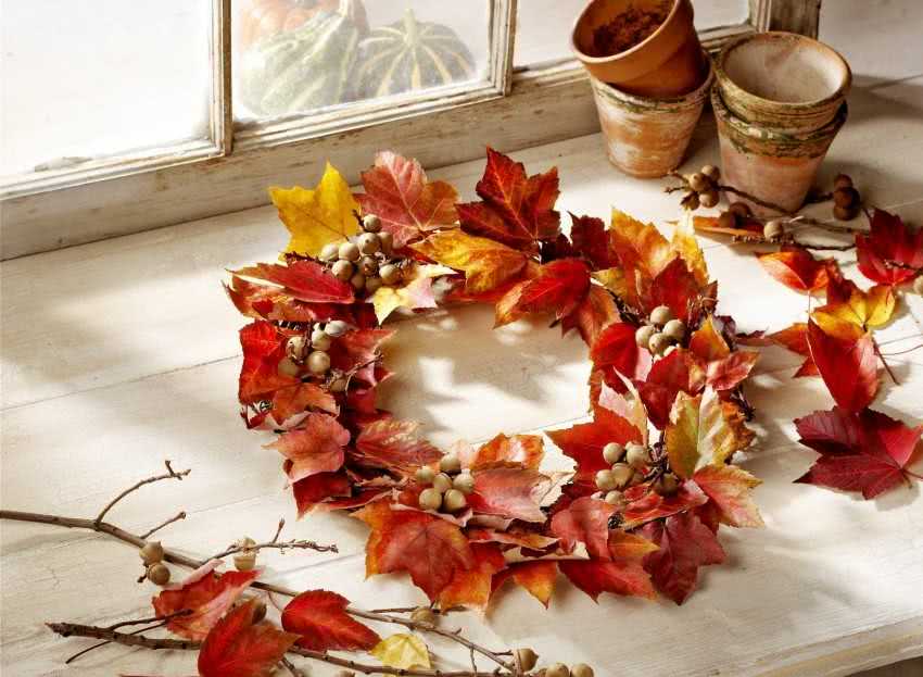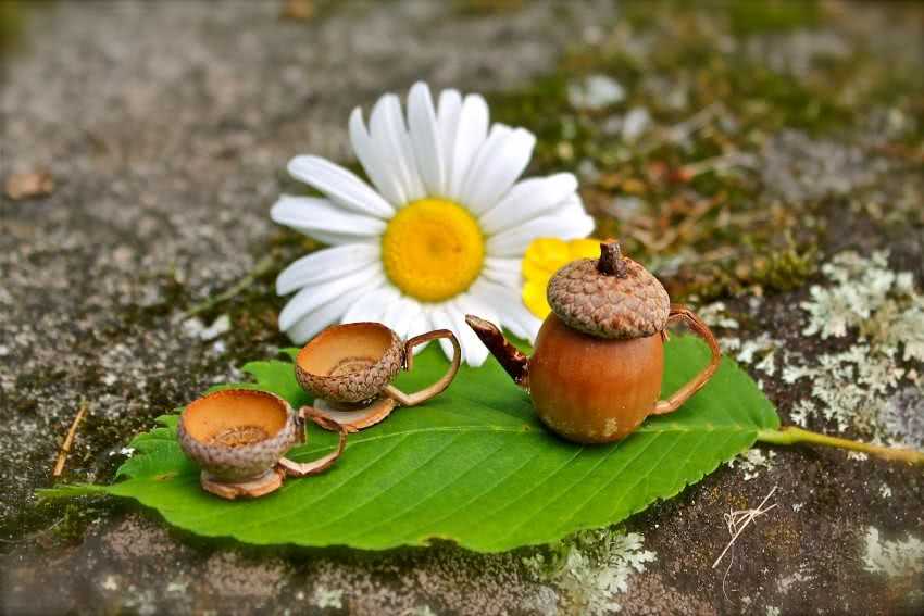 Таким же универсальным осенним плодом деревьев являются дубовые желуди. Они бывают немного разными по величине, что позволяет собирать из них интересные композиции. Желуди держатся на дереве с помощью чашечек или плюсок, которые интересны как сами по себе, так и вместе с плодами.