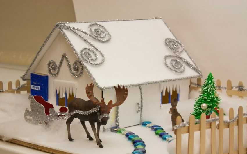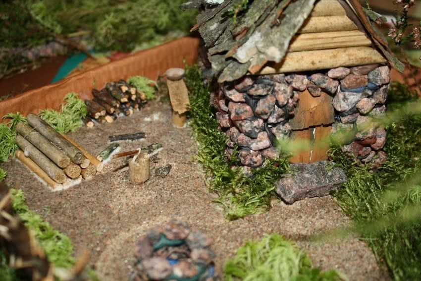 Основа домика обматывается пеньковой веревкой или обклеивается палочками от мороженого, или веточками деревьев. Для крыши подойдут веточки, кора деревьев, мох. Деревья, животных, растения изготовить можно из природных материалов (шишек, семян деревьев, желудей, веточки можжевельника, ягоды кустарников).