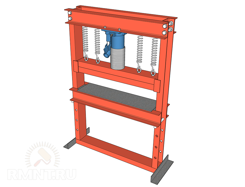 При отсутствии верхней колодки необходимо закрепить пружины к штоку домкрата. Для этого понадобится шайба, внутреннее отверстие которой больше регулировочного винта штока, но меньше диаметра поршня. Пружина крепится к ней через два небольших отверстия по краям и фиксируется к верхней балке аналогичным образом или на приваренных крючках. Располагать пружину строго вертикально не обязательно, вы можете компенсировать излишек длины наклонным положением.
