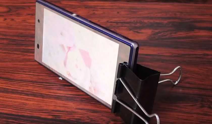 Альтернативой зажимам становятся канцелярские скрепки, согнутые в виде миниатюрных подставок. Картонной основы для такого держателя не требуется. Двух крупных скрепок обычно хватает, чтобы удержать смартфон.