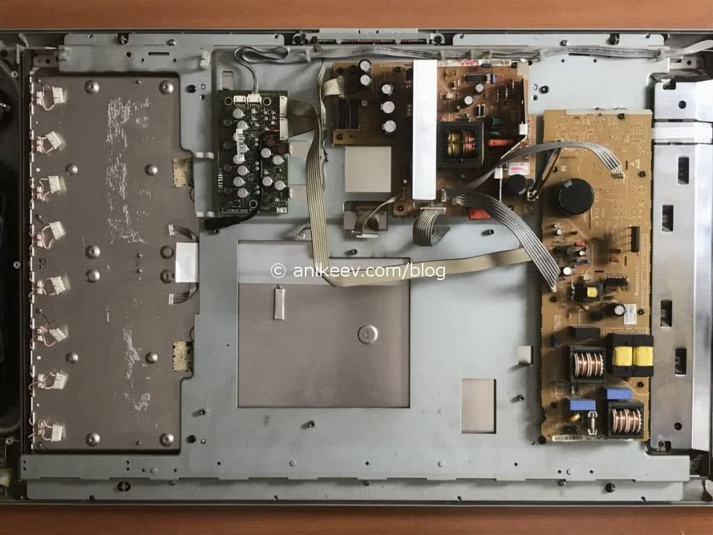 В телевизоре имеются три основные платы — main, T-con и блок питания, все они хорошо видны на фото.
