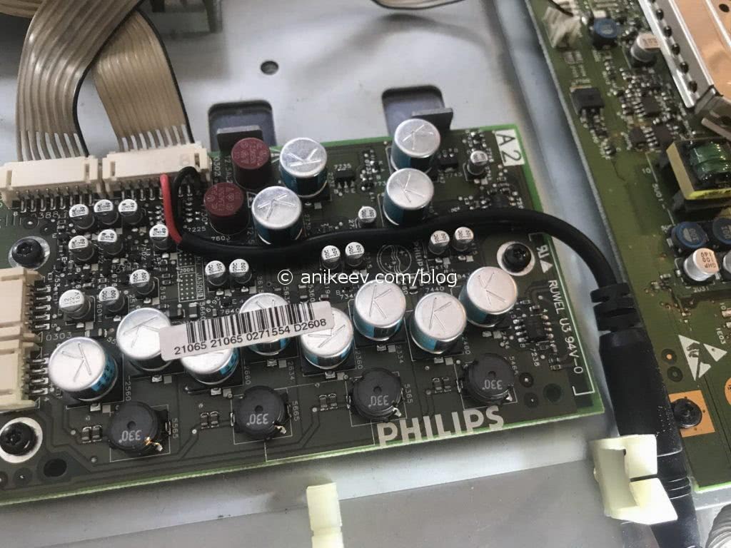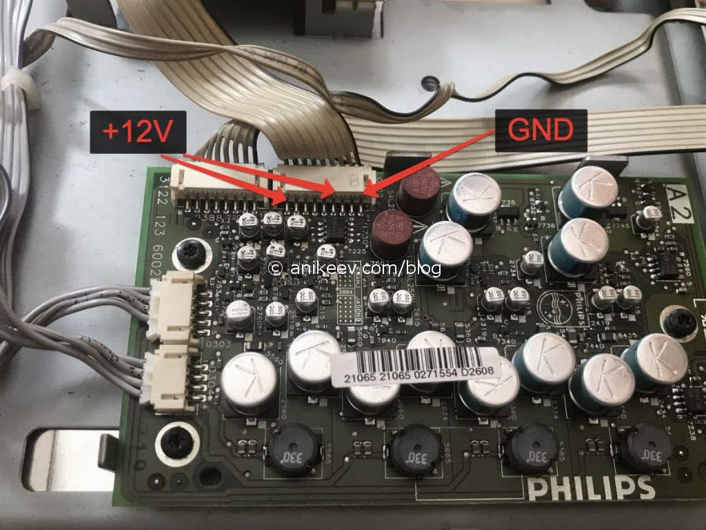 Если вы решили использовать драйвер светодиодной подсветки на 12В, убедитесь, что блок питания имеет выход с таким напряжением. Можно конечно найти на плате точку с напряжением питания 12В, но подключение к ней драйвера ленты способно вызвать «просадку» напряжения и нестабильную работу электроники.