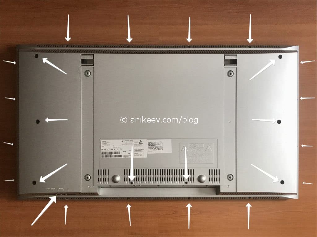 Настало время удалить переднюю рамку телевизора — откручиваем болтики крепления по всему контуру, кладем изделие на заднюю крышку и снимаем рамку.