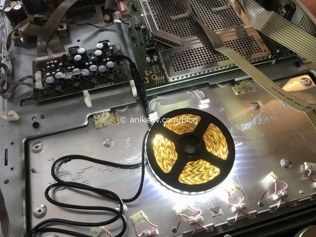 Ура! Лента светится, когда телевизор включен. И не светится, когда он в режиме stand-by. Теперь пора разобрать телевизор до конца и заменить CCFL-подсветку на светодиодную ленту.