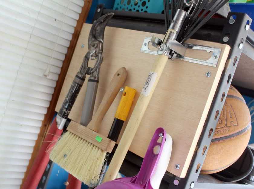 Если в гараже имеется отдельное помещение (щитовая, подсобка), его дверь можно переоборудовать в своеобразный стеллаж для хранения лёгких небольших принадлежностей.