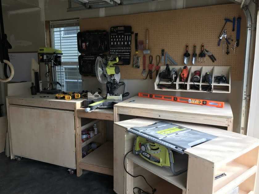 Для изготовления столов и верстаков оптимально использовать доски или древесные плиты в качестве столешниц и полок стеллажей. Каркас лучше делать из металлического профиля, поскольку инструмент имеет большой вес. Существует масса способов обустройства рабочего места.