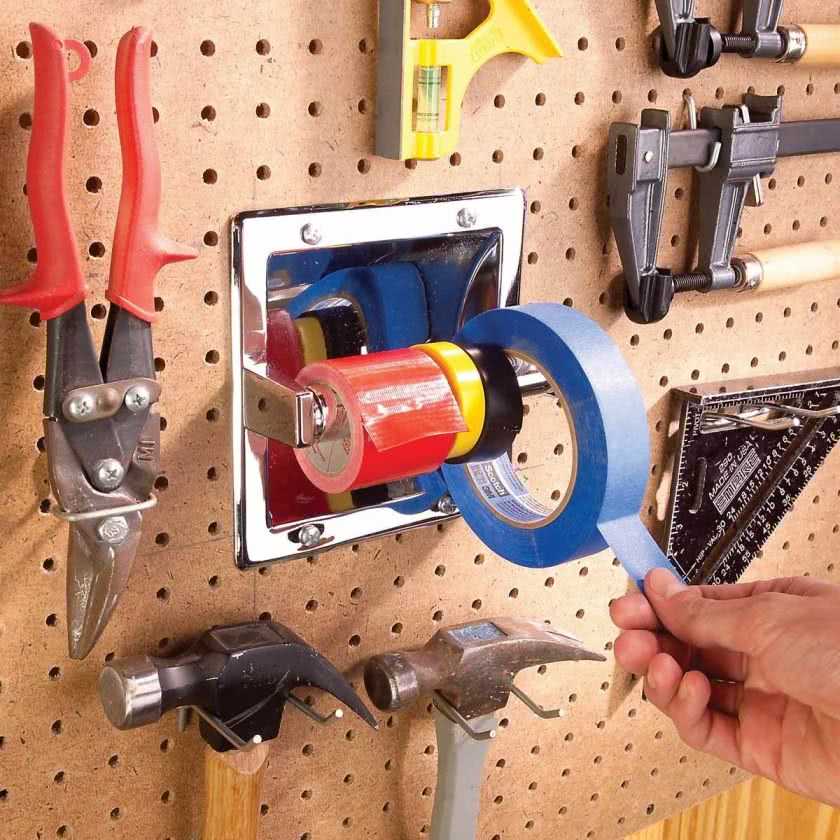 К стеллажу дополнительно можно изготовить и закрепить крепления для строительных уровней, удлинителей и прочих инструментов, которые можно хранить в висячем положении.