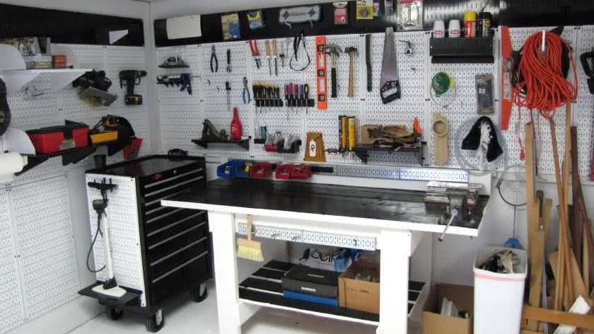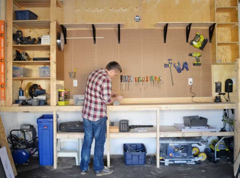 Вдоль дальней стены (напротив входа). На всю длину стены можно смонтировать верстак или просто рабочий стол. Сверху стоит расположить стеллажи для хранения рабочего инвентаря. Между рабочей зоной и стеллажом к стене можно прикрепить сетку или крючки для размещения ручных инструментов.
