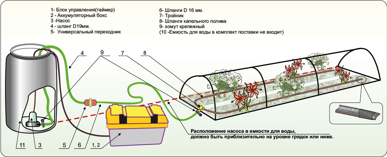 При наличии таймера и контроллера система будет работать полностью на автомате, а вода подаваться в нужное время.