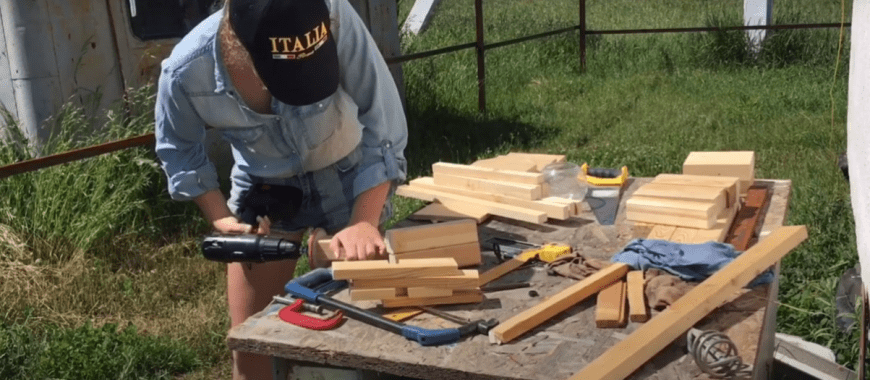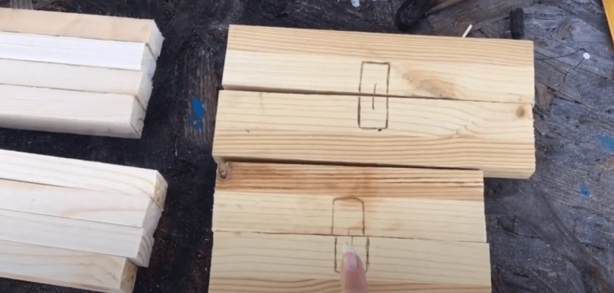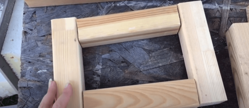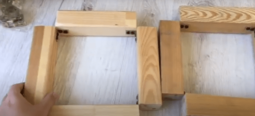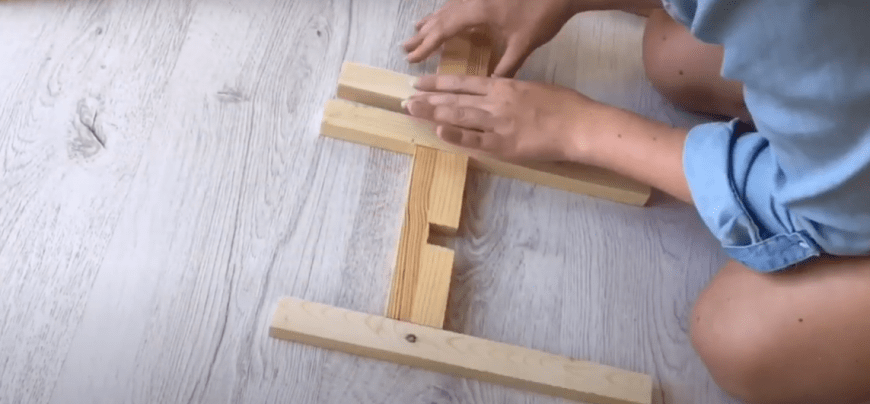 Проверяем, чтобы перпендикулярные рейки-перекладины на двух сторонах будущей подставки под растения находились на одинаковом уровне от пола.