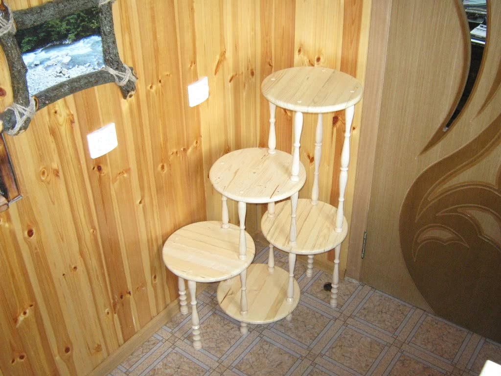 Самым доступным материалом для изготовления цветочной подставки в домашних условиях служит дерево. Для работы можно применить старые полочки, ненужные детали домашней мебели.