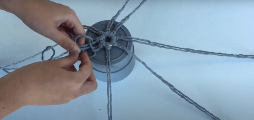 - Канат пропускают через готовые отверстия, фиксируют на нужном уровне с помощью узлов.