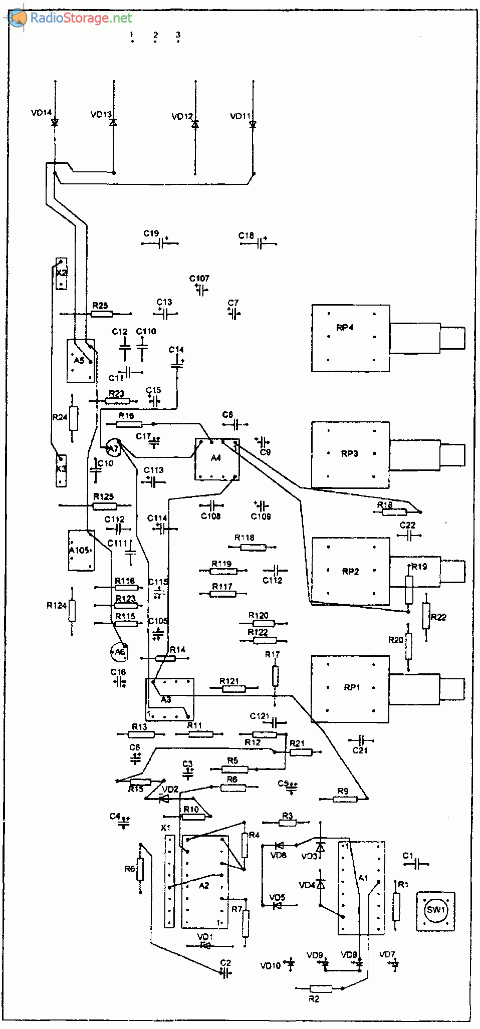 Практически все детали (кроме силового трансформатора и панели входных разъемов) расположены на одной печатной плате из фольгированного стеклотексталита с односторнним расположением печатных дорожек.