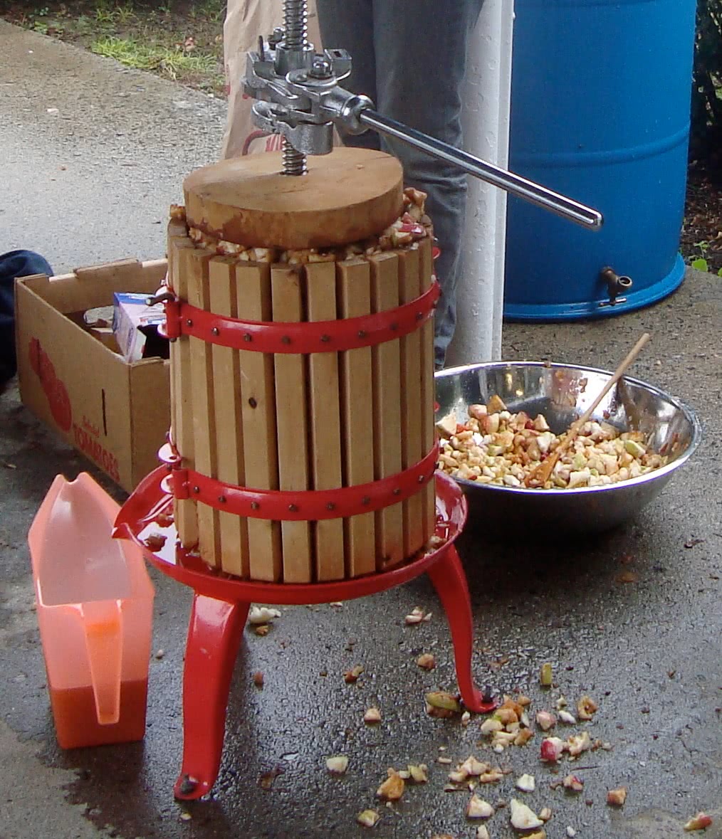 В качестве пресса можно использовать также эластичный бочонок. Он подключается к водопроводу и расширятся под напором воды. Пресс давит на яблоки, в результате чего выделяется сок.