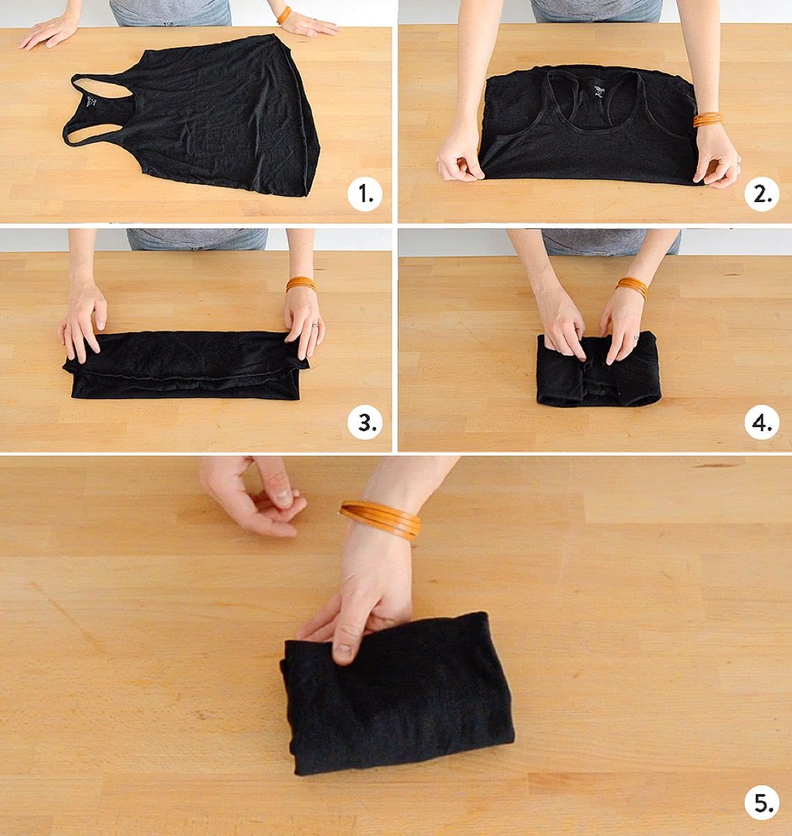 Изделия без рукавов обычно и так лежат достаточно компактно, но есть способ сложить их еще более аккуратно. Схема предельно проста.