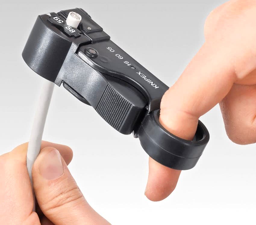 Для удаления изоляции с коаксиальных кабелей хорошей моделью является инструмент Knipex KN-166005SB. Он способен в один прием снять наружную оплетку, экран и изоляцию. Стриппер оснащен тремя встроенными ножами, для каждого из которых можно настроить глубину при помощи шестигранного ключа. Удаление изоляции осуществляется посредством прокручивания стриппера на 360°.