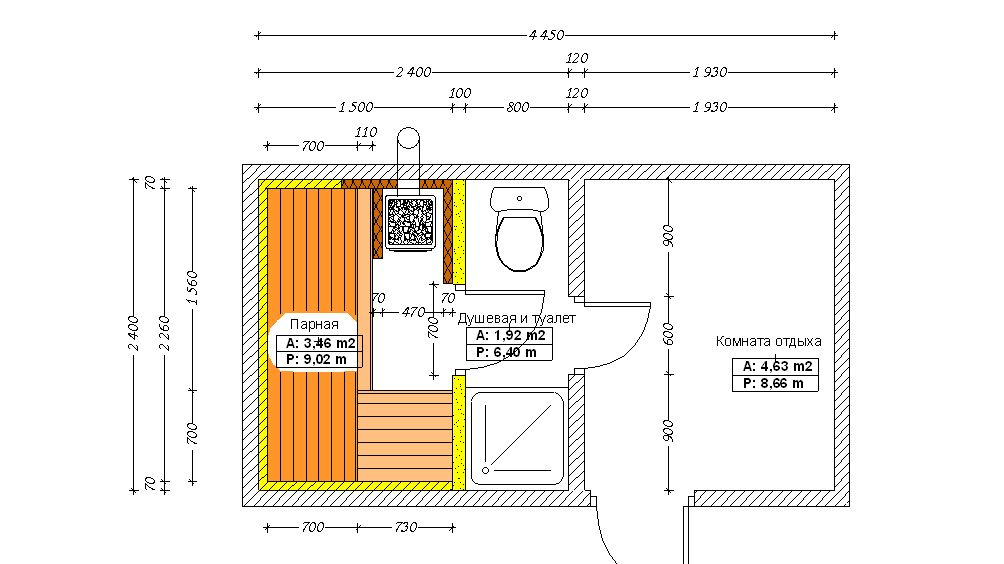 С комнаты отдыха проход ведет в помывочную (7,8 кв. м.), а потом в парную (7,8 кв. м.). Все комнаты расположены таким образом, что лишь минимальное количество тепла покидает последнее помещение.