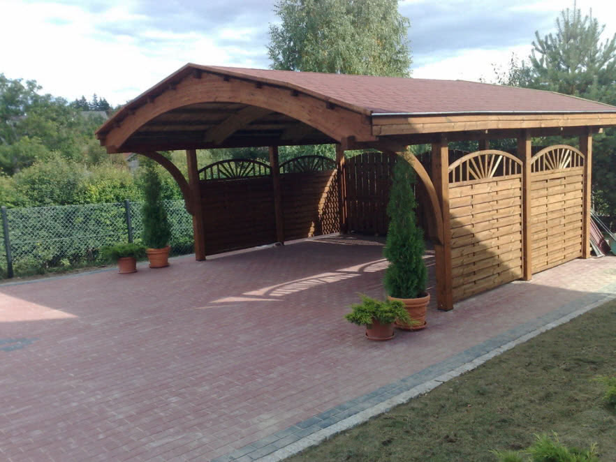 - деревянные конструкции обычно строят рядом с домом из дерева. Такое сооружение обходится недорого. Опоры изготавливают из обрезного бруса, а обрешетку из строганой доски;