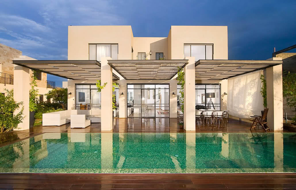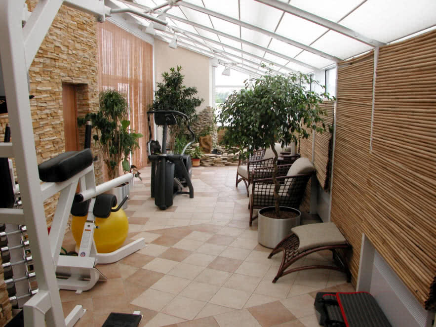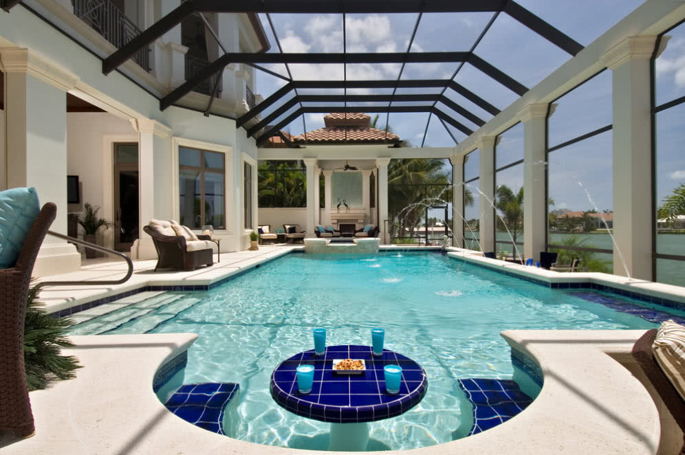 При таком типе навеса лучше всего будет конструировать закрытий вариант «тепличного» вида. Если в конструкции использовать раздвижные элементы, то ими можно будет управлять, открывая секции в жаркое время и закрывая их во время ветра или дождя. Оптимальным вариантом будут прозрачные покрытия, которые не помешают обзору и создадут приятное эстетическое впечатление.