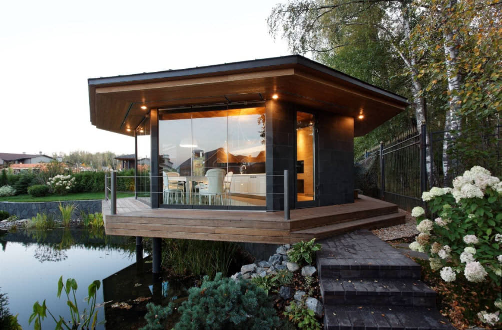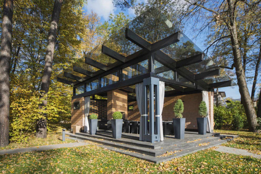 Это один из самых любимых типов навеса у всех собственников домов, который может выполняться в любой удобной форме: круг, квадрат, многогранник и т.д. Такие навесы оптимально размещать в наиболее живописной зоне участка или же на небольшой возвышенности. Также беседка может быть открытого типа, в таком случае достаточно опор и самой крыши, что будет защищать от плохой погоды.