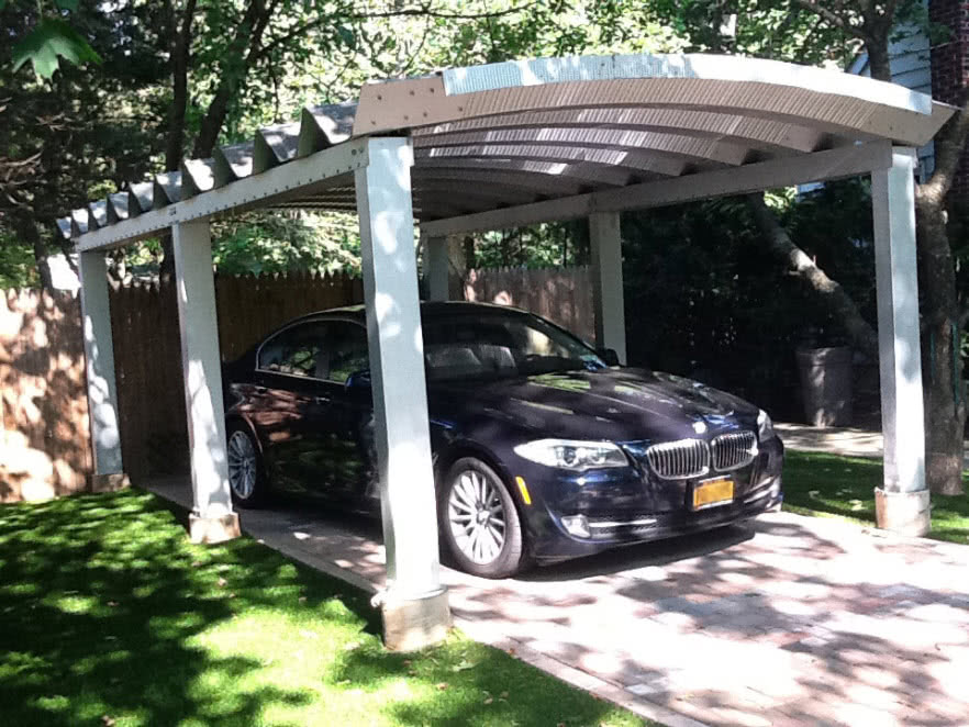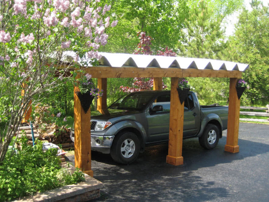Деревянный навес для машины непрактичен, поэтому из дерева лучше делать отдельные элементы, такие как обрешетка и опорные столбы. Если же вы собираетесь полностью монтировать навес из дерева, то следует тщательно обработать его водозащитным средством. Концы деревянных опорных стоек обязательно нужно обшить металлическим листом, если этого не сделать, то со временем они начнут загнивать, что приведет к нарушению равновесия.