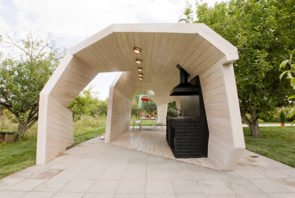 Такой можно установить своими руками во дворе любого частного дома перед мангалом или барбекю. Пока навес не используется, он спрятан под металлическую крышу над мангалом. В остальное время он создает уютную тень над столиком и делает эту часть территории во дворе очень комфортной и располагающей к отдыху.