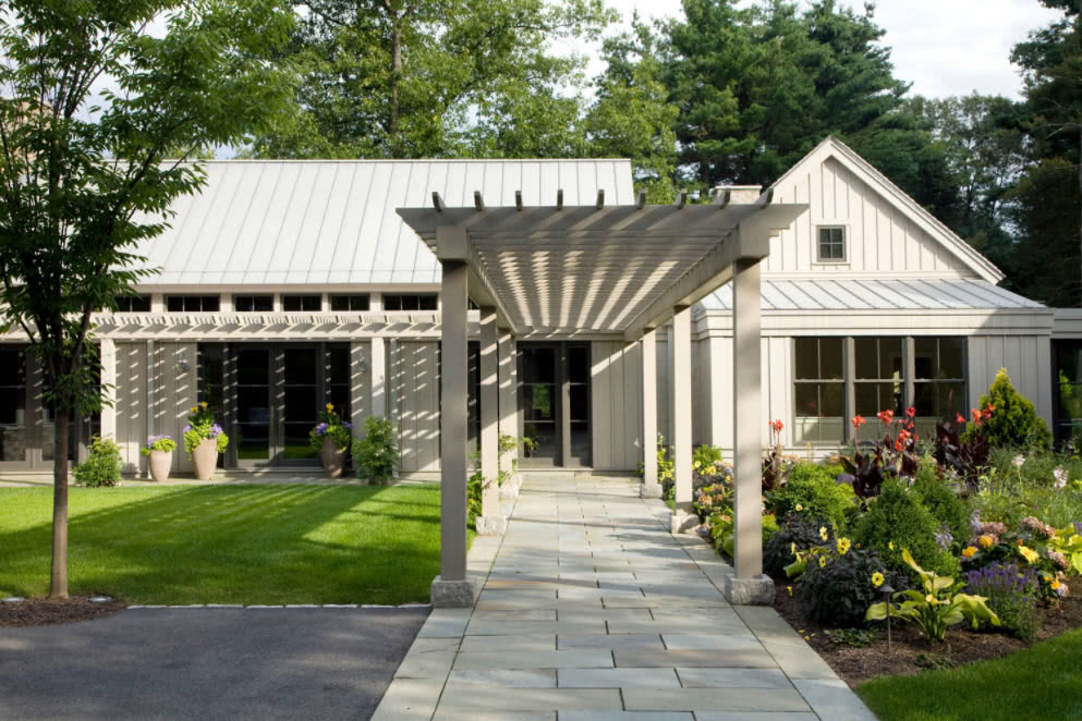 В первую очередь навес — это средство защиты, что оградит определенную территорию от дождя и снега, падающих листьев и жарких лучей солнца. Следовательно, их расположение на территории частного дома будет оптимально там, где предполагаются зоны отдыха или же участки наибольшей «проходимости» (там, где человек проходит чаще всего).
