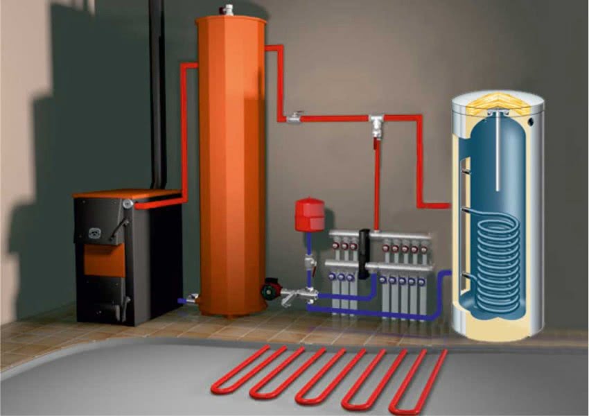 Аналогичным образом нагреватель присоединяется к более сложным системам с несколькими котлами и контурами отопления. Единственное условие: бойлер должен получать самый горячий теплоноситель, поэтому врезается в магистраль первым, а к распределительной гребенке гидрострелки подключается напрямую, без трехходового вентиля. Пример показан на схеме обвязки методом первичных / вторичных колец.
