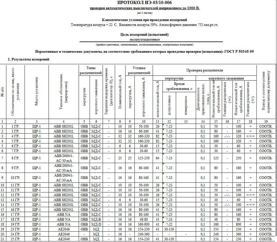 Все результаты проводимых работ заносятся в протокол. В документе отражается величина наводимого ампеража и время срабатывания автомата. Протокол прогрузки подписывается лицом, проводящим испытания. Образец заполнения протокола проверки предоставлен ниже: