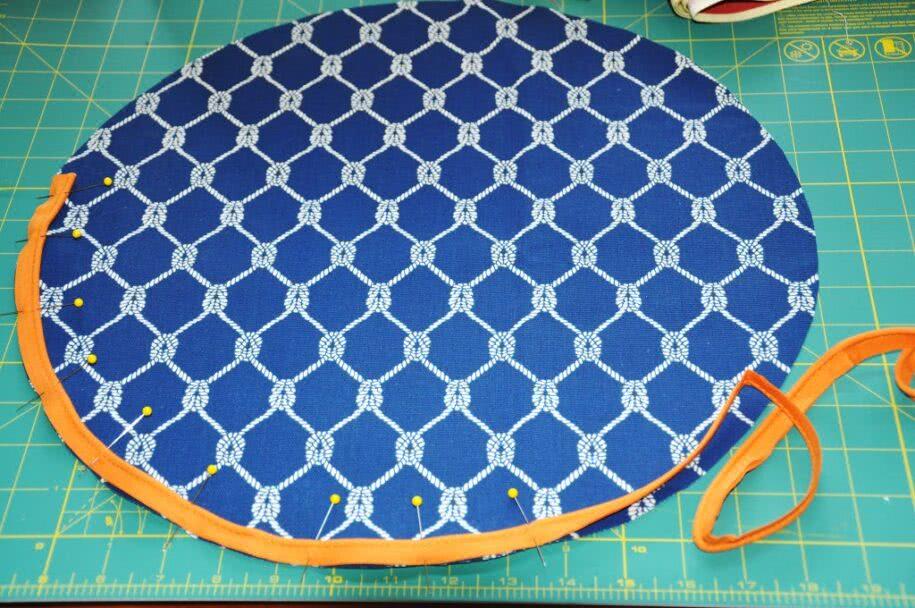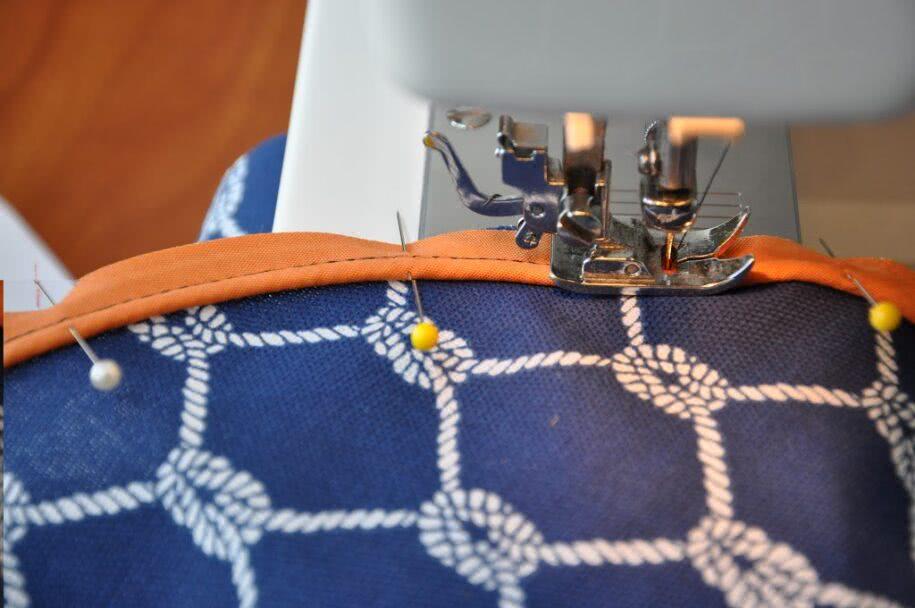 Боковину прострачивают так, чтобы получилась труба, а фрагмент под сиденье пришивают в конце. Дно прикрепляется вручную после того, как черновая обтяжка надевается на пуф. Следите, чтобы чехол сел максимально плотно.