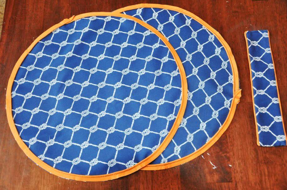 - Далее делаем обивку, руководствуясь той же технологией, что и в предыдущем варианте. Выкраиваем донышко, поскольку у нас пуф на колёсах, то снизу его обтягивать тканью не понадобится. Затем кроим боковую часть, сшиваем. Лучше в боковом шве сделать змейку, поскольку после того как всё будет готово, вам лишь останется одеть чехол и застегнуть молнию.