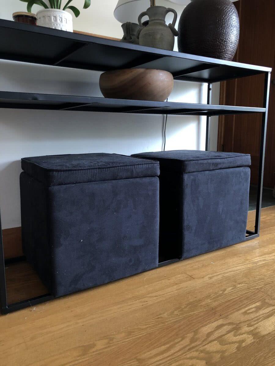 - Любителям работать молотком и пилой доступен любой вариант в виде кубика для прихожей с мягким сидением. Его за час можно собрать из остатков ДСП и фанеры, в качестве основы – бруски и деревянные уголки, другие обрезки.