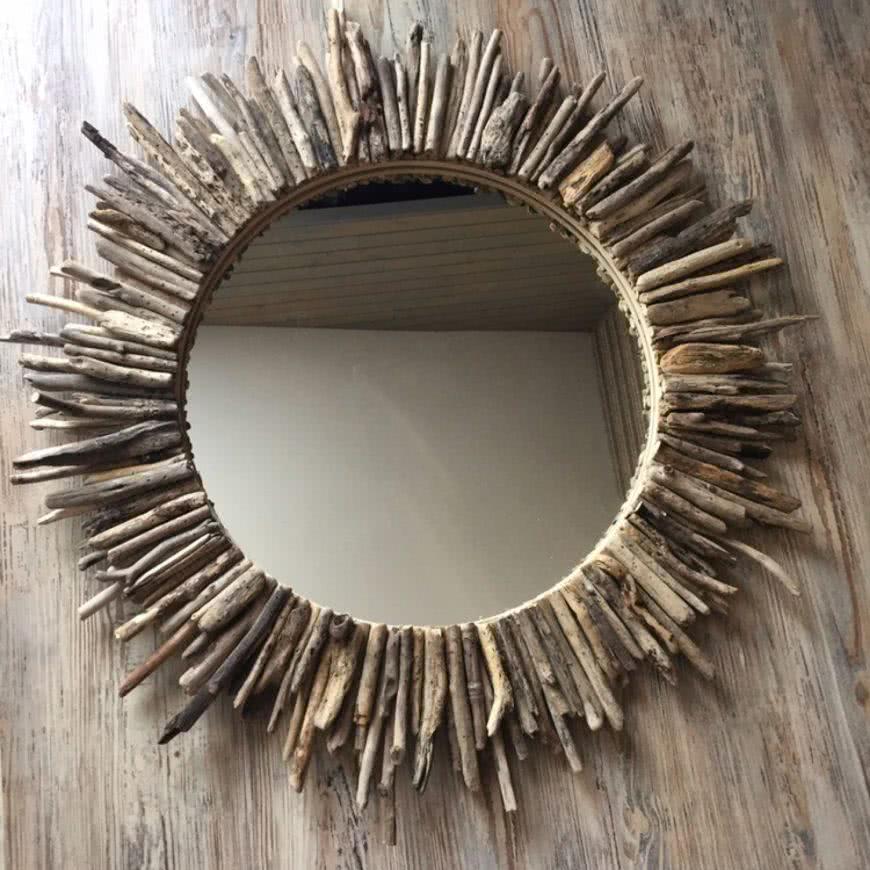 - смастерить деревянное обрамление для зеркала из ровных палок, совмещенных между собой бечевкой или плотными веревками.