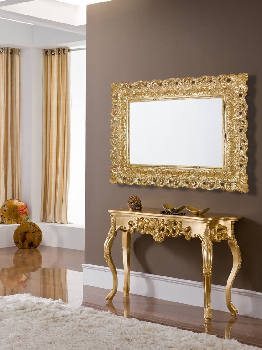 Украсьте гостиную рамой под бронзу или золотой моделью. Так, вы сделаете акцент на зеркале. Подобное изделие смотрится богато и изысканно
