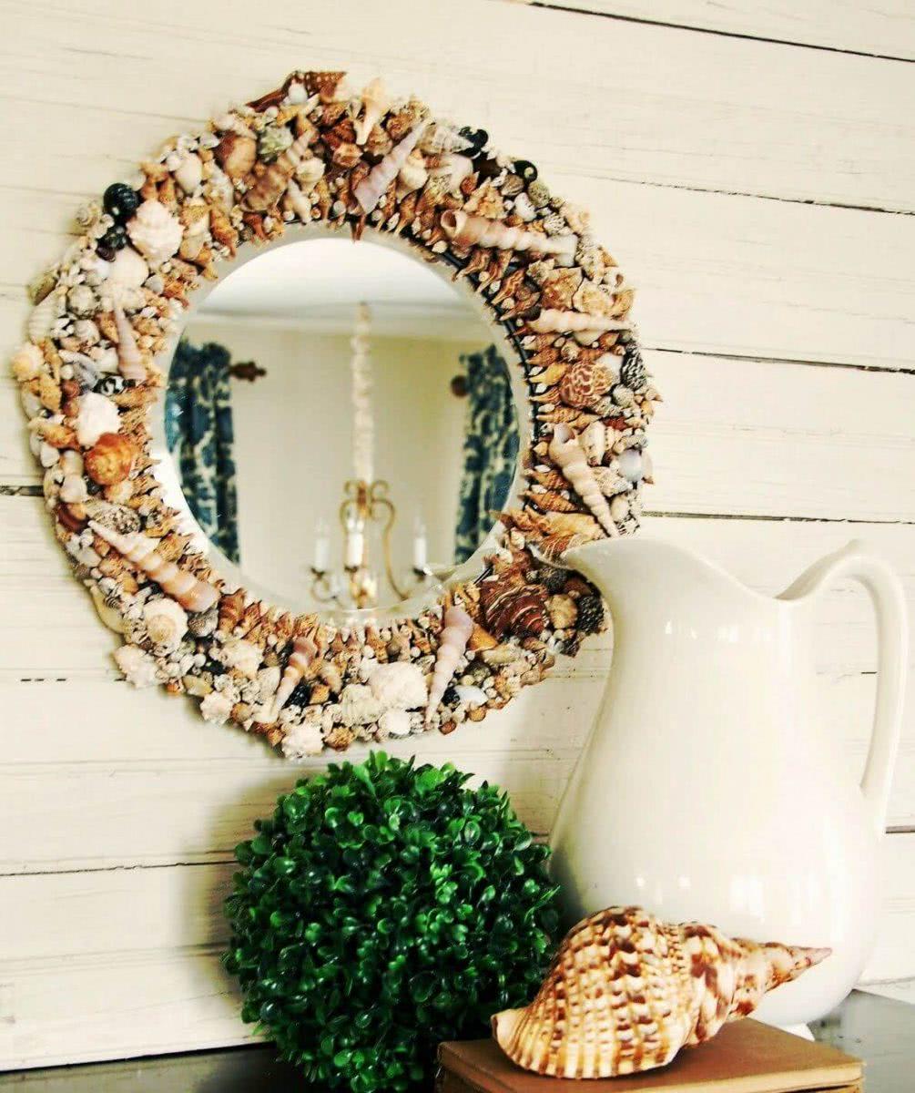 Летом наиболее актуально украшение зеркал ракушками и всевозможными камушками: