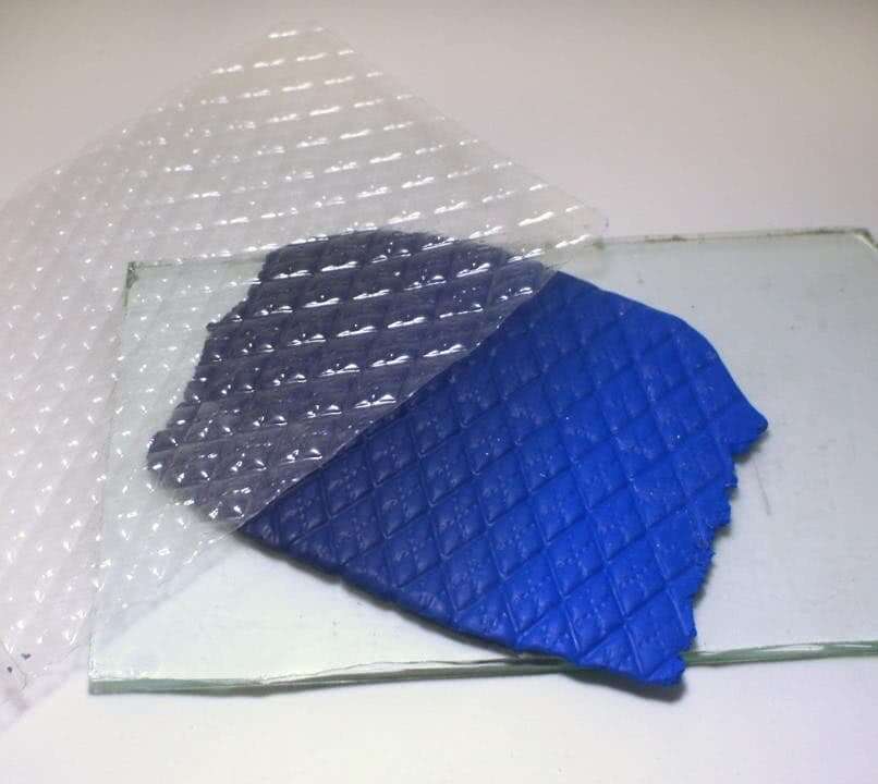 Берем еще один кусок полимерной глины, раскатываем и переносим текстурный рисунок. Кладем поверх первой ножки и обрезаем лишние детали. Запекаем детали по инструкции производителя глины.