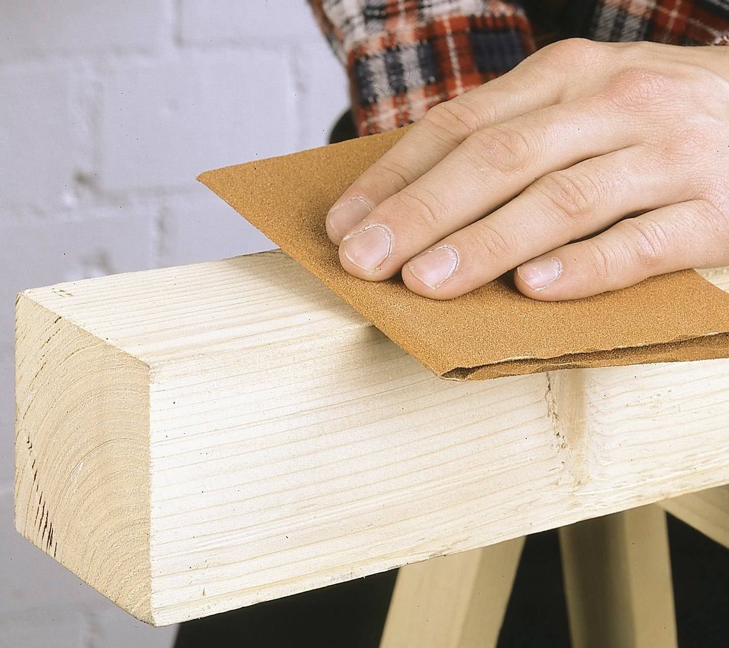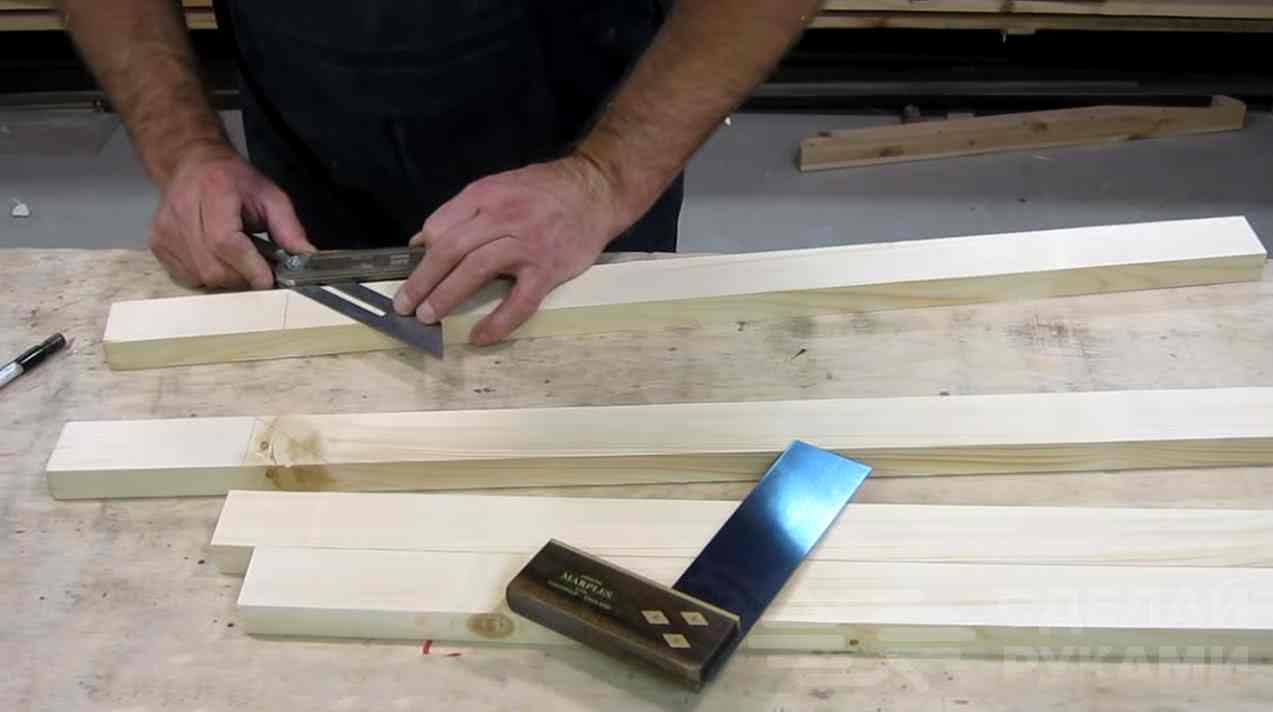 Прежде чем приступить непосредственно к монтажу, сосновые бруски распиливают на заготовки. Их края шлифуют наждачной бумагой до образования ровной гладкой поверхности. Можно оформить срезы в виде полукругов для придания более эстетичного внешнего вида.