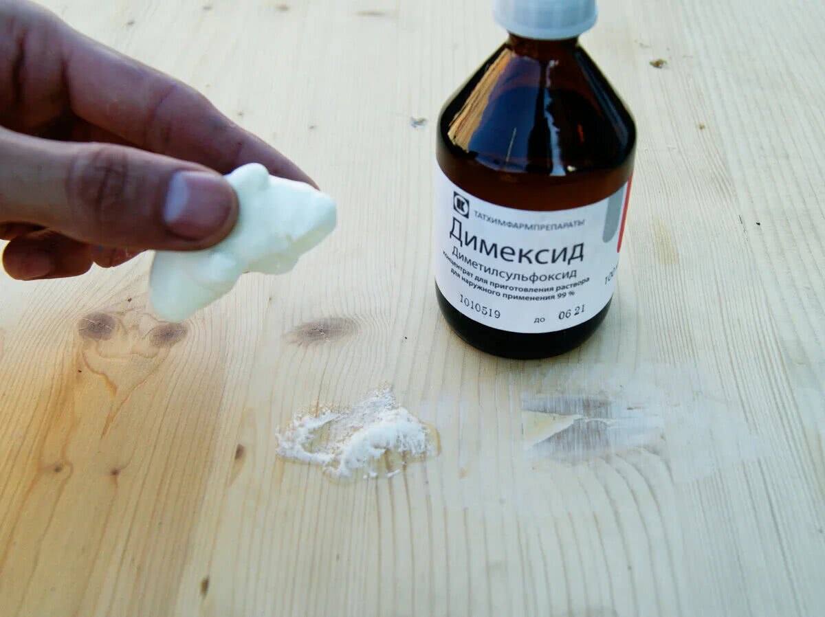 - Химические вещества подойдут для засохших пятен. Можно использовать специальные растворы или все тот же димексид.