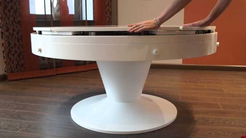 Раздвижная конструкция позволяет устранить проблему. Ее сущность заключается в следующем. В обычном состоянии она выглядит, как небольшой круглый столик на 3-4 человека. Он легко перемещается и устанавливается на новом месте.