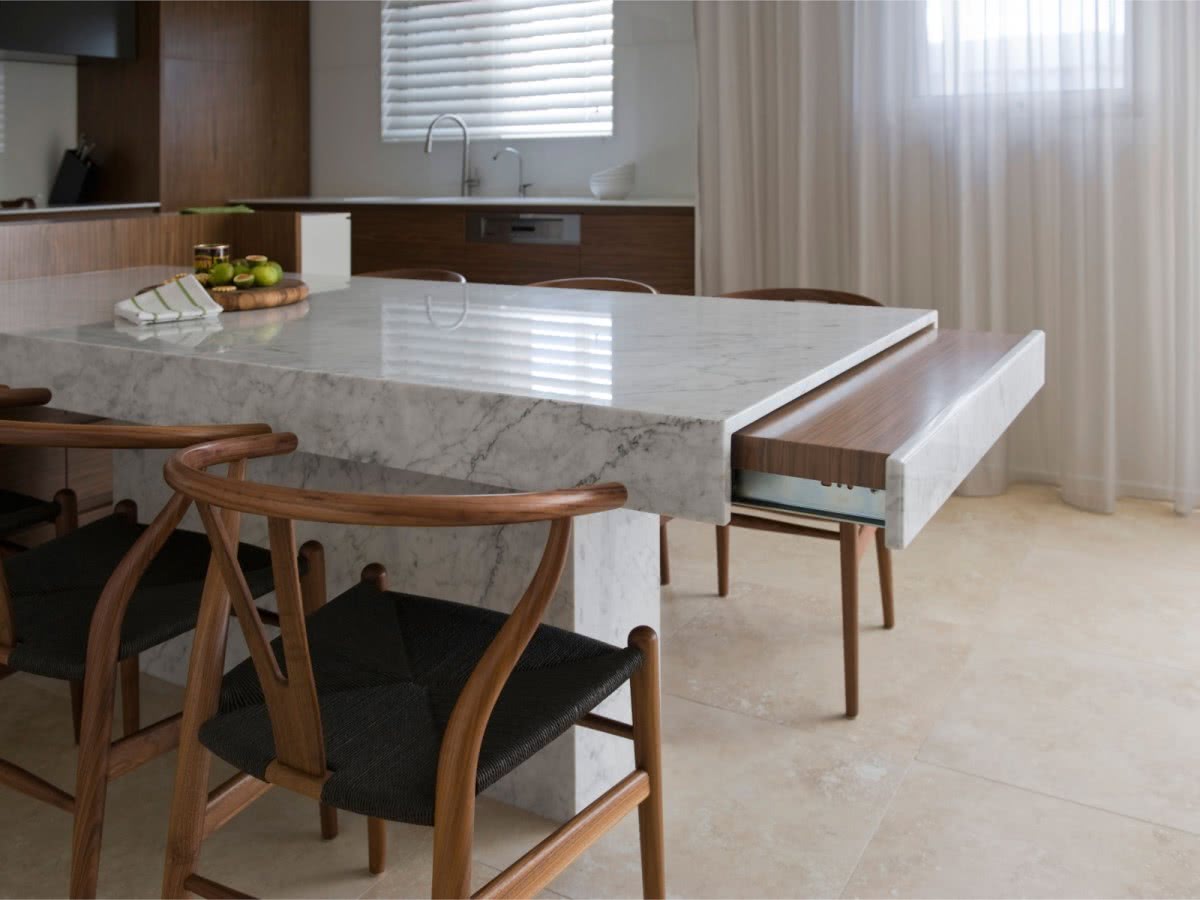 Вместо обычного обеденного стола на кухне можно поставить его выдвижную модель.