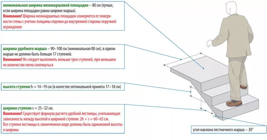 Важно обеспечить удобство и безопасность пользования лестницей. Строительные нормы и правила, а также положения действующих стандартов регламентируют следующие геометрические размеры и параметры элементов лестничного марша: