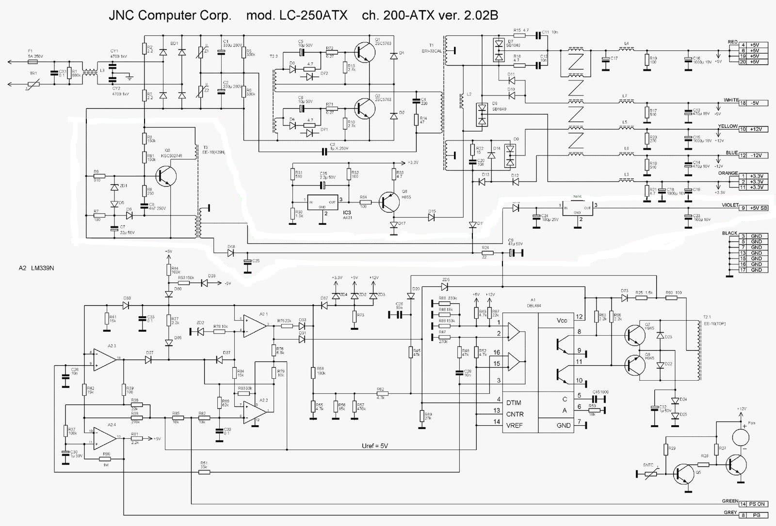 В основе LC-250ATX лежит принцип ШИМ, реализованный на стандартной для таких схем микросхеме TL494. Он генерирует импульсы, которые усиливаются ключами на транзисторах Q6, Q7, затем через трансформатор T2 с ключей на транзисторах Q1 формируются импульсы Q2 на первичной обмотке трансформатора T1. Эти импульсы преобразуются через вторичные обмотки и поступают на выпрямители различного напряжения, из которых только канал +12 вольт представляет интерес для изменения.
