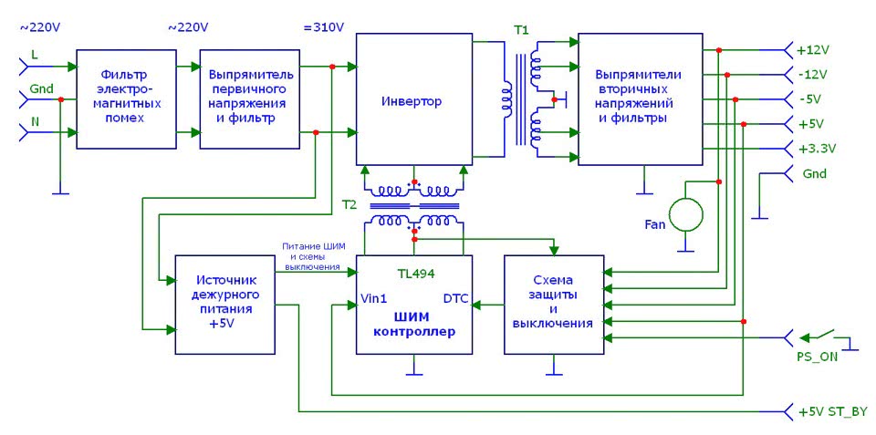 Хотя все они построены по одной и той же структурной схеме и работают по схожему принципу, блоки питания могут быть физически реализованы по-разному. Поэтому первым делом нужно попытаться найти принципиальную схему реально существующего агрегата.