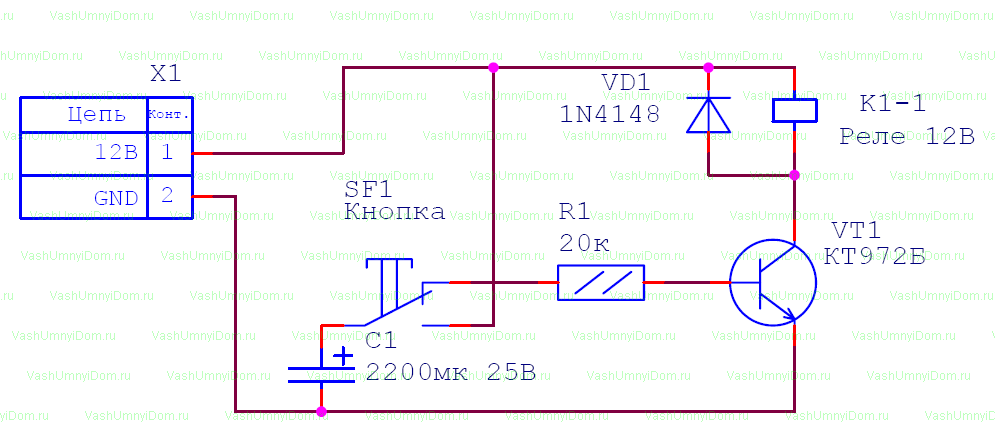 Максимальную выдержку здесь можно установить в несколько десятков секунд, так как ее величина будет задаваться сопротивлением резистора и емкостью. Существенным недостатком является то, что эта схема несет угрозу человеческой жизни при поражении электротоком. Поэтому далее рассмотрим пример изготовления реле времени на 12В.