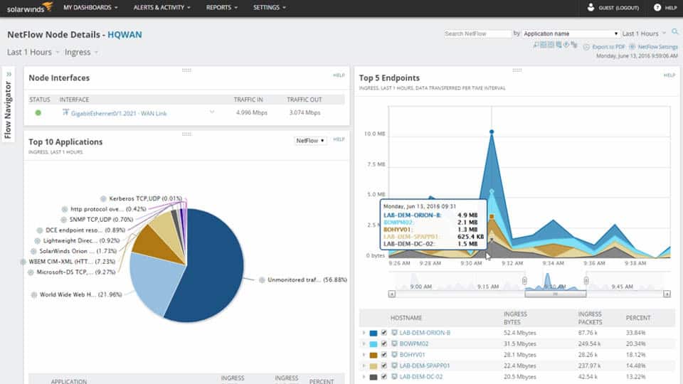 Пакет анализатора пропускной способности сети SolarWinds является хорошим выбором для адресации пропускной способности сети, поскольку она помогает вам указать на основную причину. Вы можете обнаружить проблемы с производительностью в вашей сети и принять меры для их устранения, чтобы пропускная способность упала до минимума.