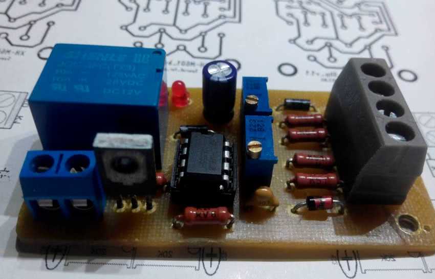 Приведем одну из наиболее простых схем. Для наглядности приводится схема и изображение печатной платы реле на 12 в.