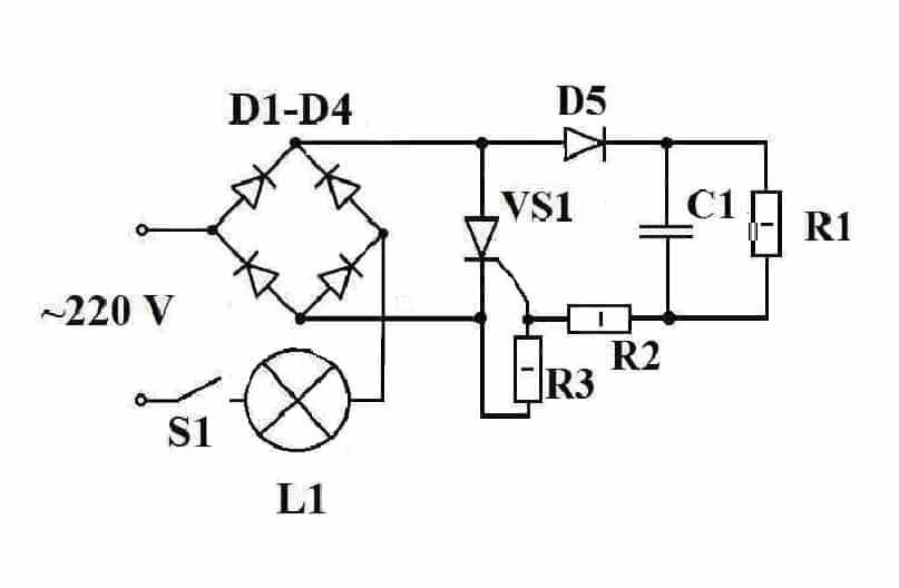 Принцип стандартный для таких сборок: постепенная зарядка конд. C1 (начинается после активации S1). Тиристор VS1 при этом открыт, на нагрузку L1 от сети идут 220В. После зарядки он закрывается, отсекая ток — лампа выключается. Пауза регулируется установкой значения на R3, подбором емкости C1.