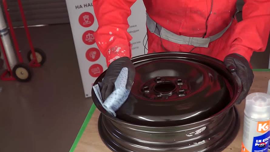 После высыхания грунта губкой синего цвета тщательно матируем весь диск автомобиля, уделяя особое внимание зоне контакта диска с резиной