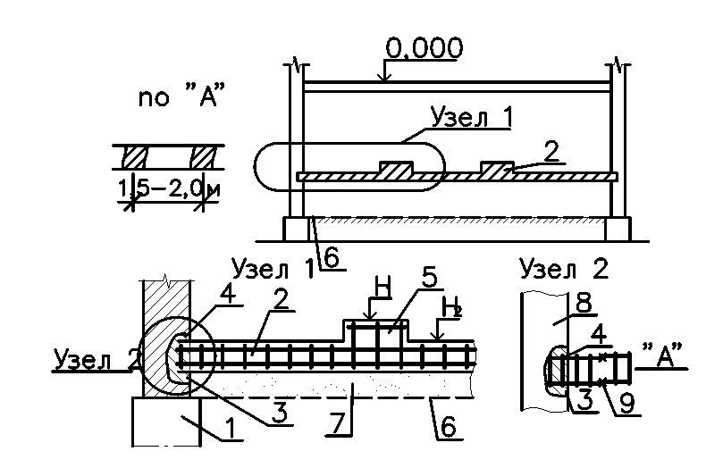 Усиление фундамента устройством монолитной плиты: 1 – существующий фундамент; 2 – плита усиления; 3 – штраба для заделки армокаркаса плиты; 4 – армокаркас заделки плиты в стену; 5 – ребра жесткости плиты; 6 – уровень разработки грунта для устройства плиты; 7 – щебеночная подготовка под плиту; 8 – несущая стена здания; 9 – электросварка армокаркасов плиты.